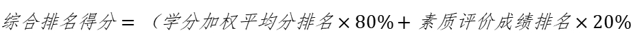 (三)需要在全院范围内进行排序的普通推免名额,以员工综合排名得分从低到高进行推荐,不再区分专业,综合排名得分相同时,按学分加权平均分从高到低排序。综合排名得分计算公式如下: