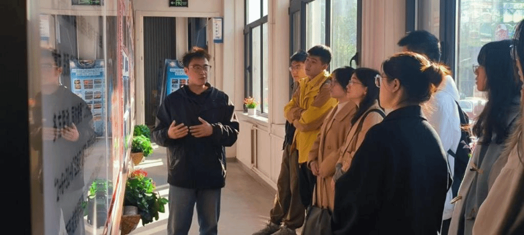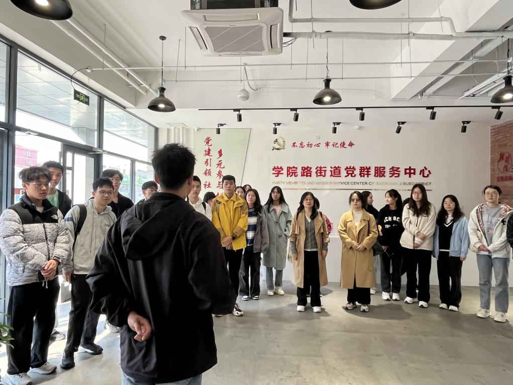 同学们跟随孙政的介绍走访了党群服务中心的室内宣传长廊、活动室、议事室、阅览室、心理室、活动广场等公共空间,这些空间犹如社区的活力枢纽,为居民们搭建起深入交流与学习的平台,促进了邻里间的互动与知识共享。孙政着重向同学们阐释了党群服务中心的党建引领多元共治的核心理念。党群服务中心以居民需求为导向,积极整合各方资源,构建起了全方位、多层次的社区服务网络,有效提升了居民的参与热情与满意度,形成了共建共治共享的良好社区治理格局。