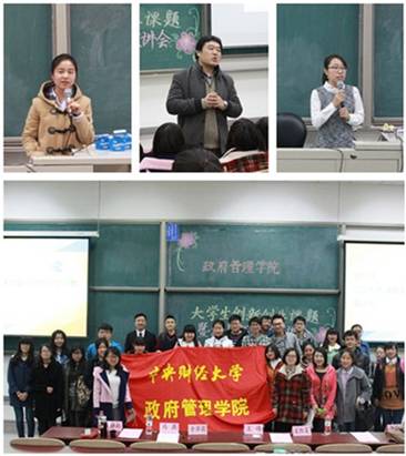 2015年3月17日,公司在沙河校区主教学楼举行老员工创新创业训练及挑战杯大赛宣讲会。出席本次活动的有城市管理系系副主任王伟副教授,城市管理系那子晔老师,团总支书记李莎莉老师,院教务干事宋红美老师,2013级辅导员孙帮谦老师,以及2014年老员工创新创业课题申报获批的公共管理2012级谭翠萍同学,保险精算13级冯燕同学,国际政治13级林诗雨同学。