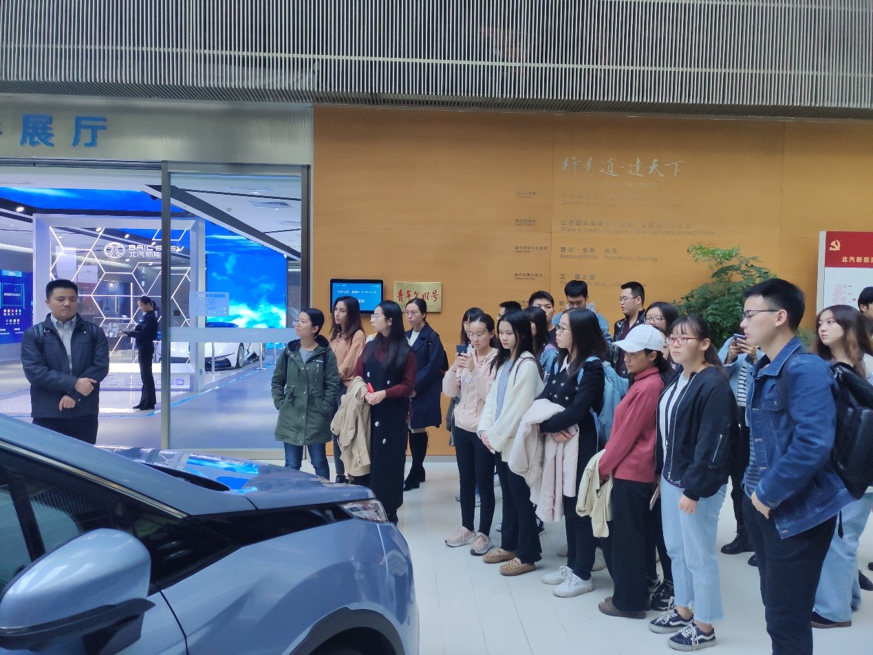 在与研发中心管理人员的交流提问中,同学们了解到,大家此次参观的地点——北汽新能源创新科技研发中心(中国·蓝谷),于2016年正式入驻亦庄经济技术开发区,其前身为诺基亚厂区。旧厂腾退、新厂进驻的发展历史引起了同学们极大的兴趣,在黄志基老师的引导下,大家结合自己的专业知识,积极发问。面对“政府的支持举措有哪些”、“税收分享机制如何”、“人才如何管理引进”、“未来投资方向如何”等问题,工作人员均给予了详细解答。北京亦庄协议收回原诺基亚厂区土地后,以“先租赁后入股”的模式与北汽合作,创建北汽新能源创新科技研发中心。在三环边没有花费巨额成本便获得了土地的使用权,可以视作政府对企业最优惠的扶持政策。北汽的生产基地基本分布在其他省份,有相当一部分税收上交给了地方政府。科研中心目前共两千名左右的科研人员,且每年会在全国范围内新招毕业生20-30余名。另外,整个厂区的改造过程也十分有趣:厂区前身为诺基亚所属,其建筑设计、施工标准、厂房质量等都在国内企业的平均水平之上,所以北汽新能源入驻之后,没有花费太多成本就在原有建筑基础上完成了改造;加之政府部门的大力支持,科研中心从签订合约到改造基本完成仅用时五个月,速度之快也令人称奇。