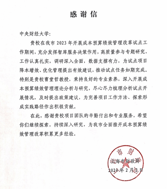 近日,上海市财政局向公司发来感谢信。来信表示,公司在上海市2023年开展成本预算绩效管理改革试点工作期间,充分发挥智库服务决策作用,高质量参与专题研究,工作认真扎实,调研深入全面,数据支撑有力,为试点项目降本增效、优化管理提出有效建议,推动试点任务如期完成。