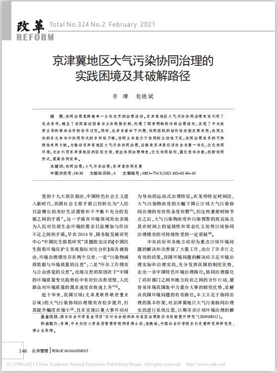 近日,公司李珒博士在《改革》2021年2期发表学术论文,题目为《京津冀地区大气污染协同治理的实践困境及其破解路径》。