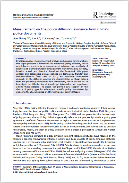 近日,公司张剑副教授在 Technology Analysis & Strategic Management 2021年2期(https://doi.org/10.1080/09537325.2021.1885641)发表学术论文,题目为Measurement on the policy diffusion: evidence from China’s policy documents.