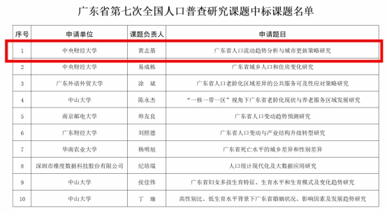 2021年12月8日,广东省第七次全国人口普查办公室发布了《广东省第七次人口普查研究课题中标课题名单的公示》文件。公司黄志基副教授团队申报的课题《广东省人口流动趋势分析与城市更新策略研究》经过专家评审、择优立项等程序,最终顺利中标。此次课题中标是公司落实产学研融合、服务国家和地方重大需求的新突破,为公司在广东省人口治理、城市更新等领域的研究夯实基础。