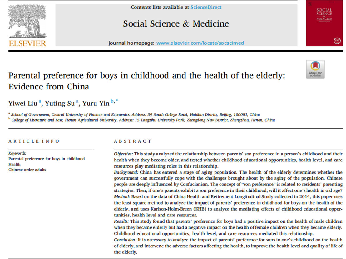 近日,英国上市官网365刘一伟博士的学术论文Parental preference for boys in childhood and the health of the elderly: Evidence from China正式发表于Social Science & Medicine(五年IF=5.299,JCR分区:Q1)2022年第302卷(https://doi.org/10.1016/j.socscimed.2022.114986)。Social Science & Medicine是社会科学领域的国际著名期刊,也是公司AAA类期刊。