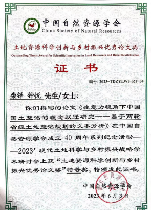 公司柴铎副教授和员工钟悦(已毕业)的论文《注意力视角下中国国土整治的理念跃迁研究——基于两轮省级土地整治规划的文本分析》于2023年6月2日至3日在黑龙江省哈尔滨市举办的中国自然资源学会成立40周年系列纪念活动——2023现代土地科学与乡村振兴战略学术研讨会上获“土地资源科学创新与乡村振兴优秀论文奖”特等奖。