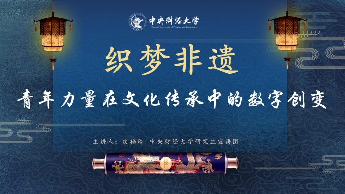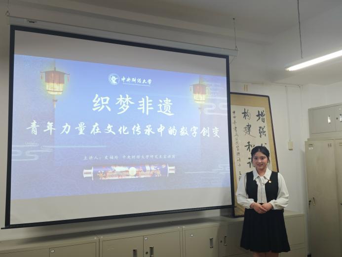 接着,公司研究生宣讲团执行团长皮福玲以“织梦非遗:青春力量在文化传承中的数字创变”进行宣讲。她基于党的二十届三中全会聚焦社会主义文化强国建设背景,说明了非物质文化遗产是中华优秀传统文化的重要组成部分。她还通过列举非遗活态化传承在数字空间发酵出圈的案例,阐述了数智技术是文化领域新质生产力的重要支撑,且让非遗在新时代焕发新生命。