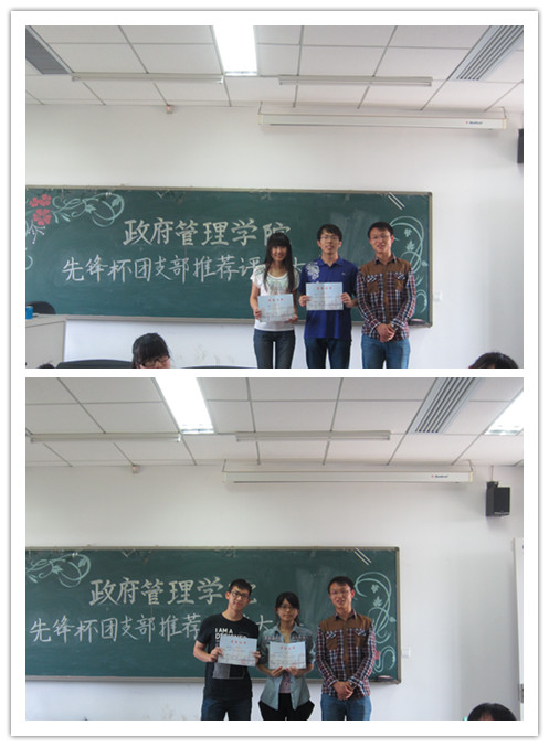 在之后的投票环节中,各支部本着公平公正的原则谨慎投票,最终国政12团支部以5票对3票优势获得推荐资格。对此,孙老师做出总结:“参评的每个支部都很优秀,获奖的支部要再接再厉,而落选的支部不要灰心,继续完善自己,争取在下次的优秀支部评选中胜出。”紧接着所有人就如何做好团支书,如何高质量完成公司工作等话题进行了探讨,老师还对大三的团支书进行表扬,肯定他们在忙碌的学业和实习中仍然积极参加团学活动,为公司团学工作的顺利进行做出贡献。此外,孙老师为校级优秀团支书及优秀团支部颁奖并合影留念。最后,他阐释了本学期所举办系列活动的核心思想:继续围绕上学期主题——“中国梦”展开各项工作,得到了大家的积极响应。