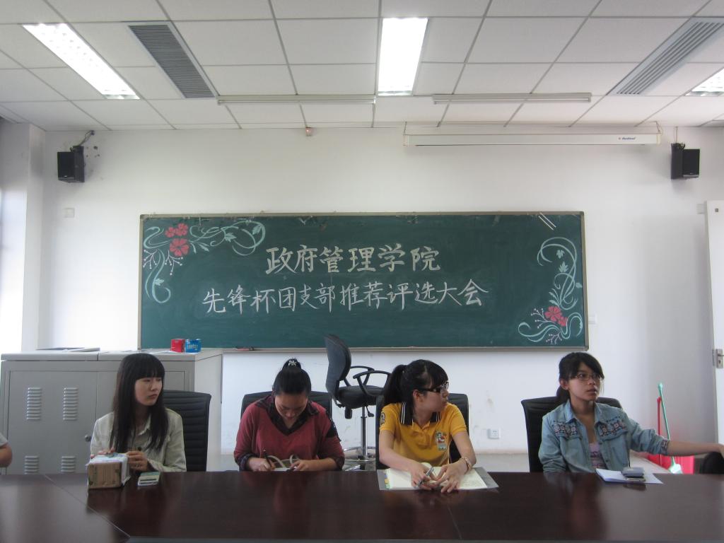 在主持人宋亦明简短的点名后,孙老师介绍了本次会议的主要内容及意义,并鼓励大家多多建言献策。在对各团支书关于团发文件阅读情况的调查中发现,有四分之三的同学有浏览公司官网的习惯,但由于时间紧张,仅有两三人阅读了本次活动的相关通知。接下来由各支部书记介绍本支部建设情况,具备推荐名单评选资格的支部11-公管-1,11-行管-2,国政12还特别说明了所在支部自入校以来的获奖情况。
