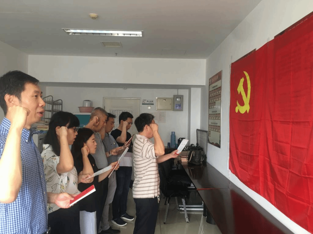 首先,在刘庆乐副教授的带领下,各位党员老师对着党旗庄严宣誓,重温入党誓词,再次坚定了“为共产主义奋斗终身,随时准备为党和人民牺牲一切”的决心。