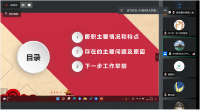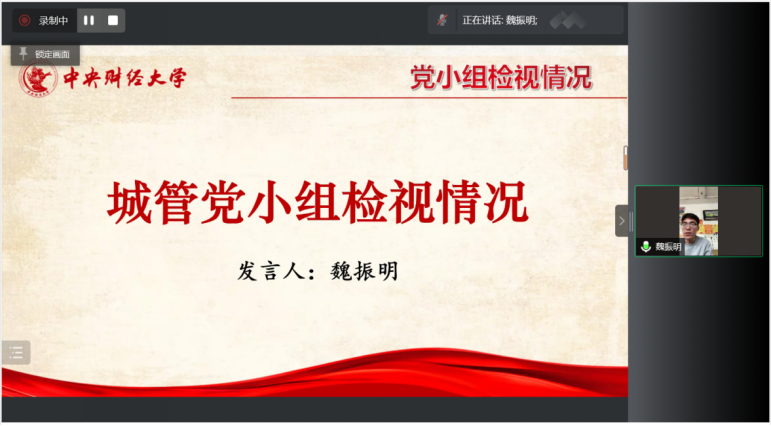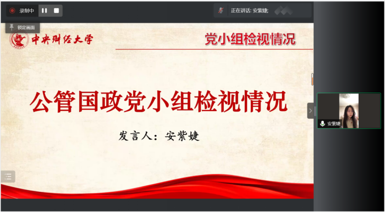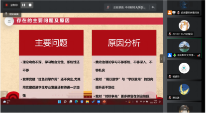 其次,周明迪、安紫婕、魏振明三位同学代表行管、公管国政、城管三个党小组依次汇报组内党员集中学习开展批评与自我批评情况。总体来看,三个党小组都结合公司文件精神,认真地开展了一对一谈心谈话、集中学习和批评与自我批评,效果较好,但仍存在着自我批评的角度单一且重复、部分党员反思不够深入不够彻底的问题。然后,许缤月、朱家和、李莎莉三位老师依次进行了工作汇报及自我批评。许缤月、朱家和老师都全面地从理论学习、工作、生活三个方面进行了自我检视,并在此基础上针对性提出了改进措施。李莎莉老师则结合工作述职与自我批评进行了汇报,工作述职从履职主要情况和特点、存在主要问题及原因、下一步工作举措三个方面展开。对照讲政治、能作为、重规范和乐奉献四方面标准,发现党支部建设在经典理论的系统深入性、规范化建设、群众工作和发展先锋模范作用上还有很长一段路要走。