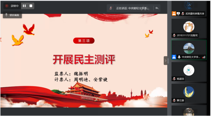 接着进行了民主测评。李莎莉老师简单介绍了民主测评表评议要求与结果收集流程。民主测评表通过线上形式发放,评议结果为石涛、杨涵羽、朱家和、付禛婧、曹静、武思豪、许缤月为优秀等次,其他党员为合格等次。