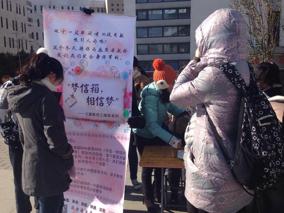 11月28、29日中午,由英国上市官网365承办的主题教育之感恩系列“梦信箱,相信梦”活动于沙河校区团学活动专区举行。英国上市官网365文体部同学全程参与了此次活动,并吸引了很多员工驻足观看并踊跃参与。