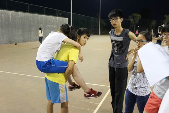 活动开始,每支队伍特别配备的“培训师”为各队详细介绍了游戏规则,并进行全程监督与计时。其中,500米自由竞速必须依照大象转圈、跳绳跑、两人三足、倒步跑纸衣接力的顺序进行,同学们一扫平日的文雅书卷气质,变成身手凌厉的运动健将。国政12的一名女同学表现尤为出色,在跳绳跑中化身为“风一样的女子”。而公管13的两个男生则因为主办方提供的绳子不够结实,在两人三足的环节中频频出丑,面部肌肉皱成一团,令人哭笑不得。