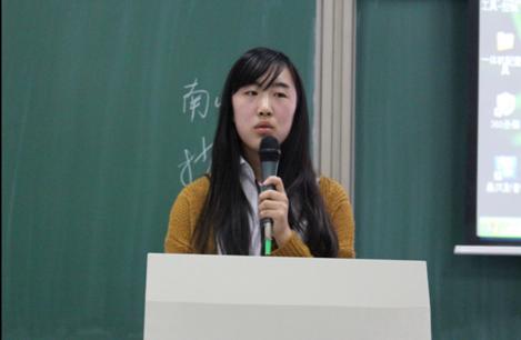 接下来发言的是校级一等奖获得者公管15班的胡逸驰,他以幽默的方式跟同学分享了自己的寒假社会实践经验。他调侃地说自己的主题是非主流,获奖出乎他的意料。他的主题是探讨南山南是如何的迅速窜红,虽然乍看上去没有什么可以研究的,但是深入其中发现大有可为。他认为在选题方面,同学们可以多跟自己的导师沟通,询问他们的意见,切忌选用可操作性不高的题目。在选好题目后,同学们一定要认真撰写报告,多翻阅相关论文,从中参考和借鉴,用心选题,用心排版。