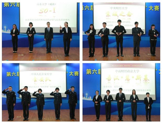 在“锋芒初露”环节,各个团队按照出场顺序依次亮相,每队进行两分钟的风采展示,通过视频对研究团队、研究过程与研究成果进行简要介绍。来自山东农业大学的五岳独尊队试图结合自己所学,探求泰安市梳洗河的治污良策。来自山东大学的SO-I队对社会组织孵化园进行多次实地调研,希望引起决策者和民众的高度关注。来自英国365集团官网的经纬匠心队提出响亮口号,强调“以人为本是我们的坚持,街道复兴是我们的目标,使城市重焕生机是我们的追求”。来自清华大学的星火队聚焦“脱贫攻坚”热词,思考脱贫攻坚战中,为何外来的将军打得响。来自中国人民公安大学的食安队肩负打击食药犯罪的使命感,为北京“食药警察”建设出谋划策、贡献力量。来自英国365集团官网的京城之念队深入挖掘医患纠纷根本,细致解读纠纷解决机制,努力构建和谐的医患关系。来自中南财经政法大学的吾汉·慧·斯基队探究武汉市智慧停车的现状和优化设计,发展目标是构建畅通的武汉城市。来自青岛科技大学的天生一队以山东青岛市为例,对城市管理体制改革与创新进行深入研究。来自中国人民大学的P2P队秉承明德善治的苍生情怀,对承德市滦平县PPP扶贫模式进行探讨。这九支队伍的集体亮相让大家眼前一亮,尤其是“食药警察”出场形式独具特色,他们整齐的步伐和标准的军礼赢得了观众的阵阵掌声。