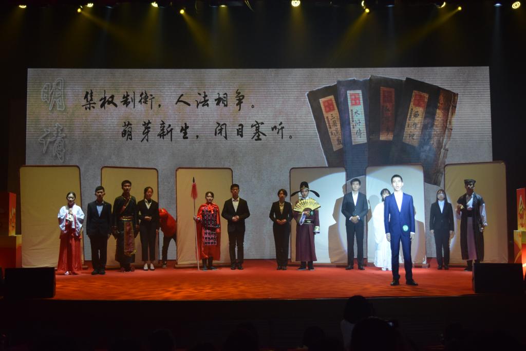来自会计公司的非鱼团队带来《同袍华夏,我在处为家》。泱泱华夏五千年,是栉风沐雨,更是骄傲辉煌。听,那编钟声传递着千年的追思;看,那七雄称霸、贞观之治、诗词歌赋闪耀着历史的光芒。“岂曰无衣,与子同袍”,他们在一句句诗词歌赋的交错吟诵间不断发问与思考,在五千年的光阴里轮换追寻,在时代号召下发出青年之声。层层迭进,安排巧妙,将千年的风霜傲骨娓娓道来。