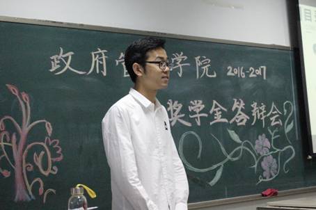 答辩开始,10位候选人依次登场。他们用精彩的PPT和自信满满的演讲展示了自己的学业成绩、个人荣誉、参加的科研实践项目与社会实践活动、员工工作、公益志愿、兴趣爱好特长等方面的优势之处。在他们当中,有的各科成绩优异、绩点综测分数亮眼;有的社会实践经历丰富、足迹遍布半个中国;有的多次参加各类科研项目与竞赛,斩获众多奖项;有的热爱体育健身,擅长田径、排球、乒乓球等运动;有的爱好广泛,博览群书,于哲学著作中探寻人生智慧……在候选同学的身上,我们领略了政管杰出学子的风采,他们的精彩发言也博得了评委老师的欣赏赞叹和17级新生代表的热烈掌声。