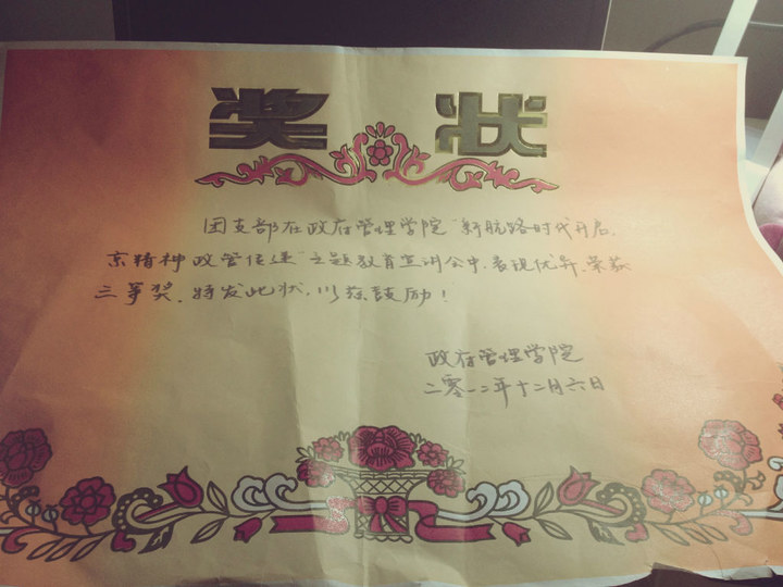 2012年12月6日晚上6点半,橙色大厅举行了“弘扬北京之精神,深悟十八大要领”主题教育宣讲活动,目的在于深化同学们对北京精神和十八大要领的理解与认识,并加以积极宣传和弘扬。国政12团支部作为第六个上场的队伍为大家奉上了精心准备的歌曲诗朗诵,一表对祖国的热爱之情。