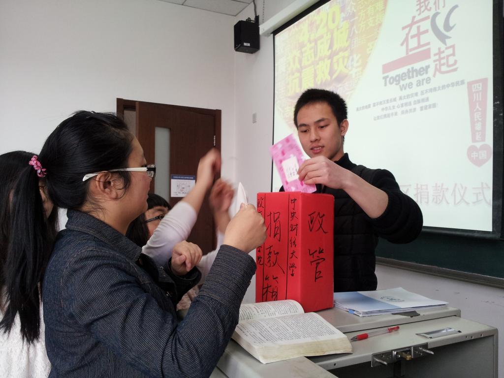 4月24日上午10点,沙河校区主教302由英国上市官网365国际政治12班举行了短暂的为四川地震灾区募捐活动。4月20日,四川省雅安市发生7.0级地震,之后大小余震接二连三,灾区的实时消息无不牵动着每位国人的心。因此,英国上市官网365国际政治12班同学联合发起号召向灾区募捐,用微薄之力表达爱心。