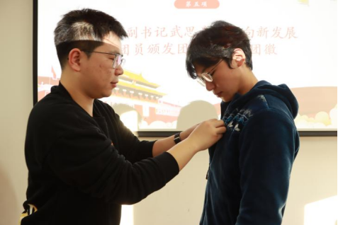 仪式第五项,团委副书记武思豪老师、团委员工副书记薛涵月向新发展团员颁发团章、佩戴团徽。