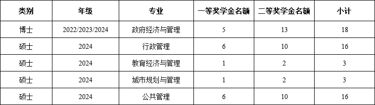 说明:本次奖学金名额分配先按既定比例核算至各专业,按四舍五入原则以专业为单位完成初步数值测算。因四舍规则导致教育经济与管理、城市规划与管理两个专业名额出现1个盈余,该名额将不再按比例分配,而是结合此两个专业的申报人综合情况进行评选,确保分配公平合理。
