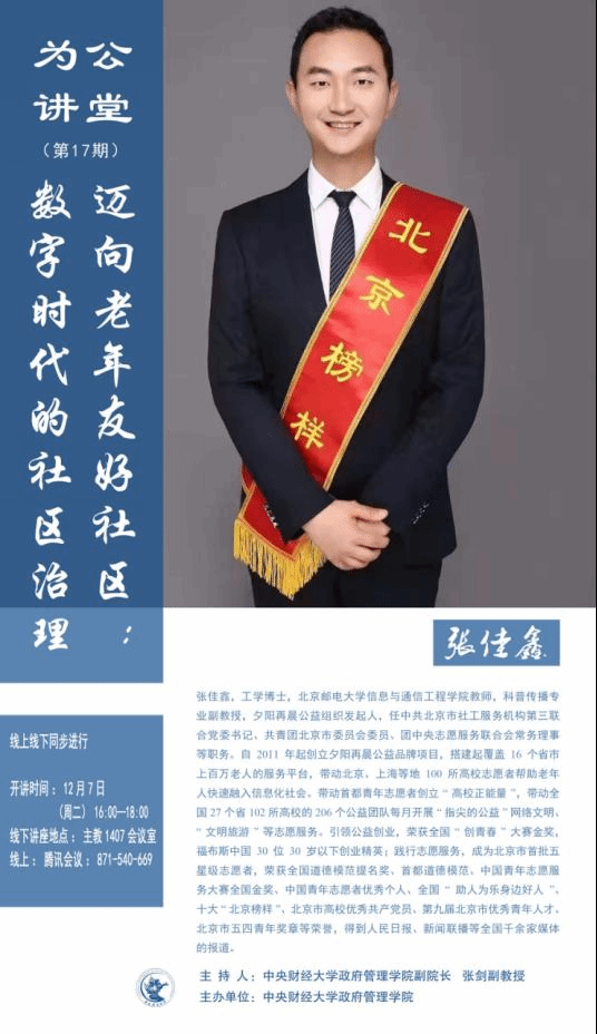 嘉宾简介:张佳鑫,工学博士,北京邮电大学信息与通信工程公司教师,科普传播专业副教授,夕阳再晨公益组织发起人,任中共北京市社工服务机构第三联合党委书记、共青团北京市委员会委员、团中央志愿服务联合会常务理事等职务。自2011年起创立夕阳再晨公益品牌项目,搭建起覆盖16个省市上百万老人的服务平台,带动北京、上海等地100所高校志愿者帮助老年人快速融入信息化社会。带动首都青年志愿者创立“高校正能量”,带动全国27个省102所高校的206个公益团队每月开展“指尖的公益”网络文明、“文明旅游”等志愿服务。引领公益创业,荣获全国“创青春”大赛金奖,福布斯中国30位30岁以下创业精英 ;践行志愿服务,成为北京市首批五星级志愿者,荣获全国道德模范提名奖、首都道德模范、中国青年志愿服务大赛全国金奖、中国青年志愿者优秀个人、全国“助人为乐身边好人”、十大“北京榜样”、北京市高校优秀共产党员、第九届北京市优秀青年人才、北京市五四青年奖章等荣誉,得到人民日报、新闻联播等全国千余家媒体的报道。