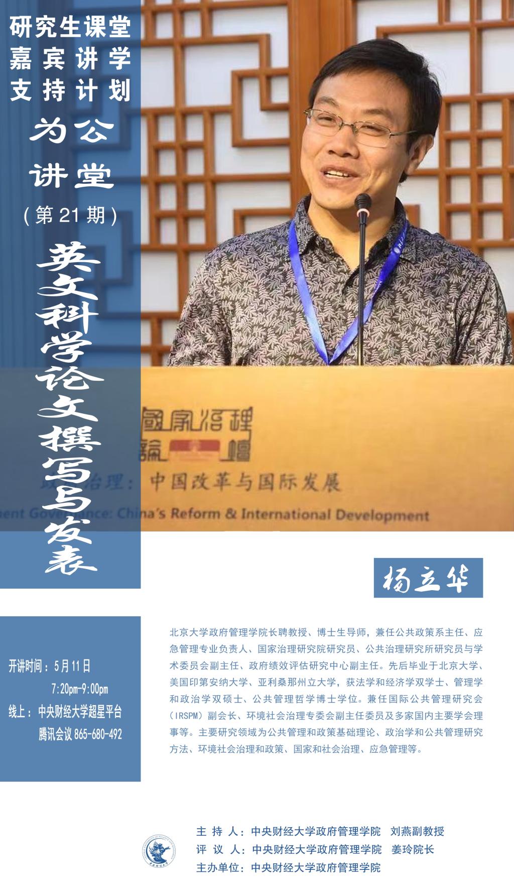 嘉宾简介:杨立华,北京大学政府管理学经理聘教授、博士生导师,兼任公共政策系主任、应急管理专业负责人、国家治理研究院研究员、公共治理研究所研究员与学术委员会副主任、政府绩效评估研究中心副主任。先后毕业于北京大学、美国印第安纳大学、亚利桑那州立大学,获法学和经济学双学士、管理学和政治学双硕士、公共管理哲学博士学位。兼任国际公共管理研究会(IRSPM)副会长、环境社会治理专委会副主任委员及多家国内主要学会理事等。主要研究领域为公共管理和政策基础理论、政治学和公共管理研究方法、环境社会治理和政策、国家和社会治理、应急管理等。