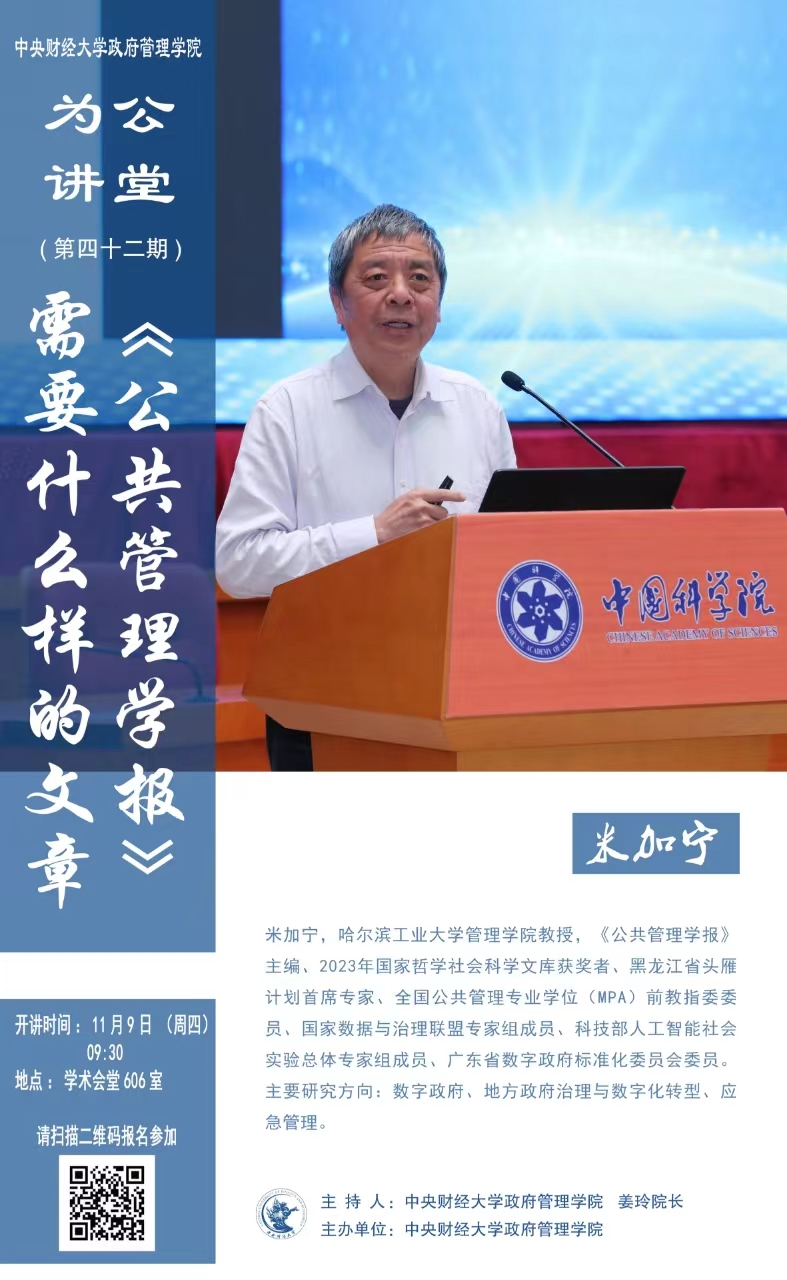 嘉宾简介:米加宁,哈尔滨工业大学管理公司教授,《公共管理学报》主编、2023年国家哲学社会科学文库获奖者、黑龙江省头雁计划首席专家、全国公共管理专业学位(MPA)前教指委委员、国家数据与治理联盟专家组成员、科技部人工智能社会实验总体专家组成员、广东省数字政府标准化委员会委员。主要研究方向:数字政府、地方政府治理与数字化转型、应急管理。