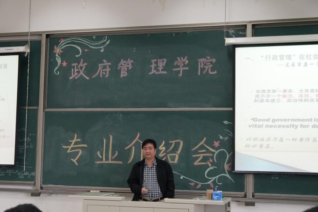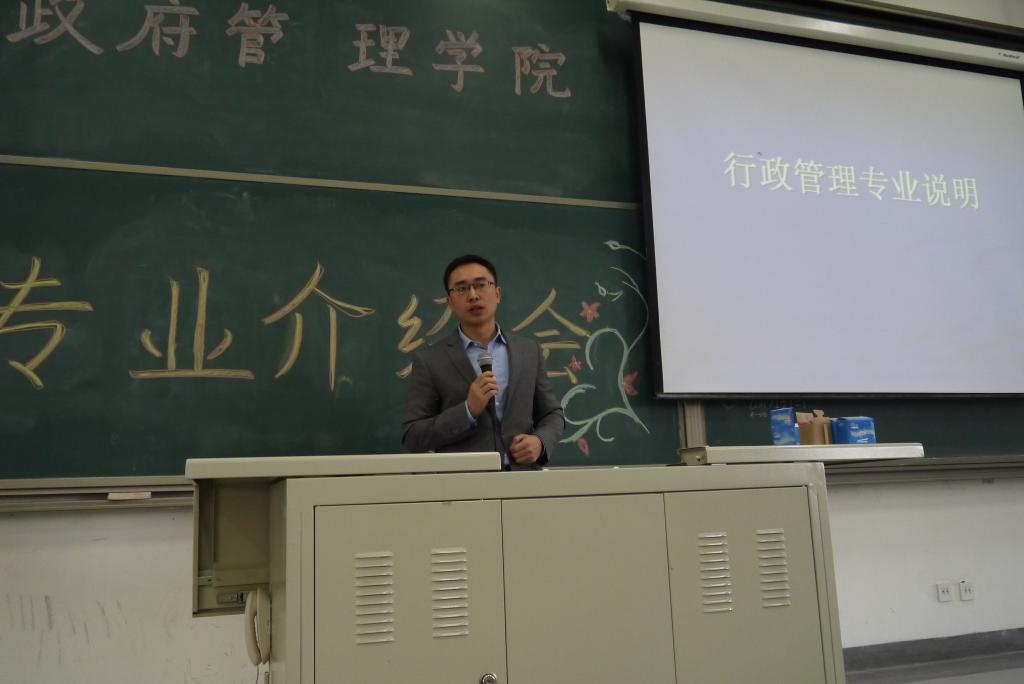 有宏观的阐述就势必有具体的研究方向,毕业于北京大学的行政管理副教授曹堂哲老师紧接着上台,为同学们们更加细节的讲解了行政管理是学什么,怎么学,时间怎么分配等几个问题,经过曹老师细心的讲解,每个同学都在心中对未来四年的学习有了大致的规划。曹老师精彩的讲话完毕之后,行管13班班级助理张颖新同学上台宣布专业介绍会圆满结束。