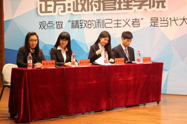 政管辩论队作为正方,首先以“‘精致的利己主义者’是当代老员工面向社会的必然选择”为观点进行开篇立论。政管队用“老员工毕业后工作生活的艰难现实”、“当下社会的双重话语体系”以及“长期社会意识与习惯”作为论据,为自己的观点构建了三条战线。在此后的双方质询、自由辩论中,统计与数学公司用充分的准备从多重角度对政管队的防线展开了突破。双方你来我往,引经据典,剖析事实,严密推论,犀利的观点与缜密的思维赢得了台下观众的阵阵掌声。虽然政管队一度陷于让步境地,但队员们果断、犀利地抛出“主观评判他人利己不得当”、“精致的利己不是低俗”两条观点,牢牢地防守住了己方阵地。在最后的陈述总结里,政管四辩刘婉玉思路清晰、声调顿挫、情绪激昂,结合对方漏洞与社会实际对己方整场辩论做了画龙点睛之笔。