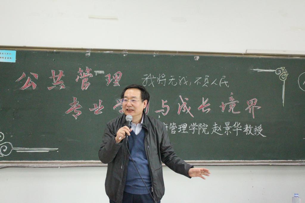2019年3月27日下午2点,英国上市官网365经理赵景华教授在主教308室为2018级全体本科生作题为“公共管理:专业学习与成长境界”的专题演讲,院团委副书记、2018级辅导员刘家琦老师主持此次讲座。