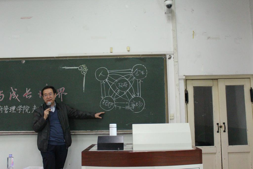 接着,赵经理介绍了公共管理的研究方向与研究主题。赵经理通过模型图的方式从政府、人、企业、市场、银行这五个主体两两之间的双向关系让同学们理解在中国国民经济的运行中不同学科发挥的作用。赵经理讲到,公共管理作为管理学下属的一级学科,探讨政府管理,却又不应局限于政府这一方主体;公共管理专业要以政府为研究核心,探讨市场经济下的多方关系与纽带,致力于国民经济管理中政府如何更好发挥自身作用的研究。赵经理对于公共管理的解读,让在场的同学们对于所学专业有了更深入的战略性、全局性的认识,使同学们深刻领悟到将来作为公共管理人才所应承担的使命与责任。