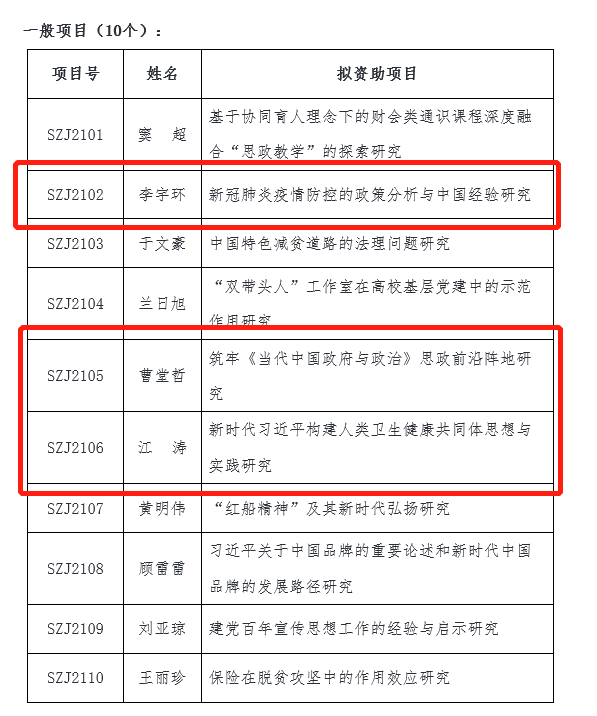 在2021年英国365集团官网“红色擎,龙马行”教师“思政+”专项支持基金资助项目遴选工作中,公司李宇环副教授申报的《新冠肺炎疫情防控的政策分析与中国经验研究》、曹堂哲教授申报的《筑牢<当代中国政府与政治>思政前沿阵地研究》和江涛副教授申报的《新时代习近平构建人类卫生健康共同体思想与实践研究》三项课题喜获立项资助(全校共10项)。