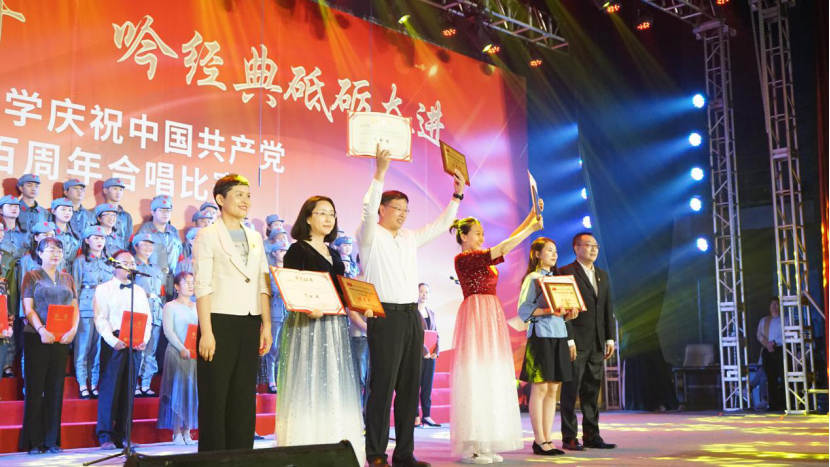 最终,英国上市官网365以92.86分的好成绩荣获本次合唱比赛决赛优秀奖。舞台上,吕阳老师高举奖状,向全体合唱师生分享胜利的喜悦。