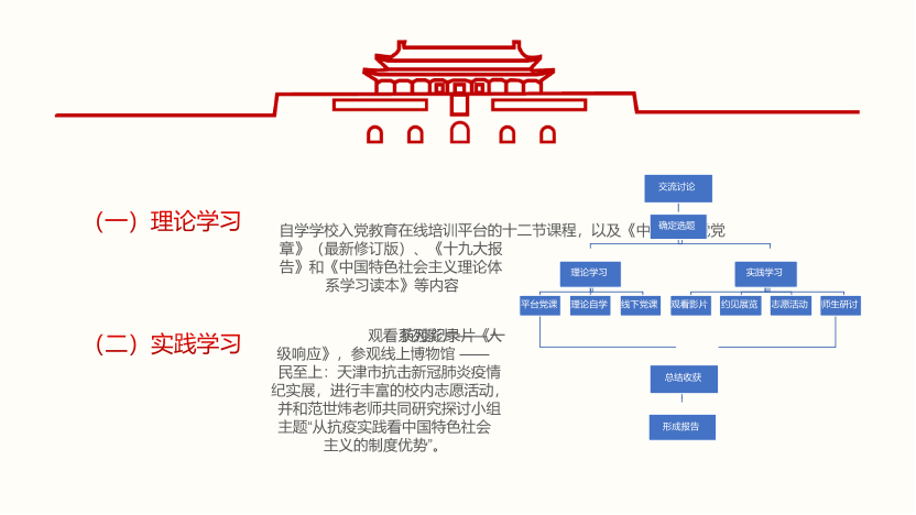“百年风雨,玉汝于成,继往开来,勇赴新征程”。 “百年风雨新征程”小组成员通过历史梳理与专题研究展开“中国共产党应对风险挑战的百年历史研究”的主题学习,小组成员认识到预判风险是防范风险的前提,把握风险走向是谋求战略主动的关键。要加强风险意识,下好先手棋,做好随时应对各种风险挑战的准备。