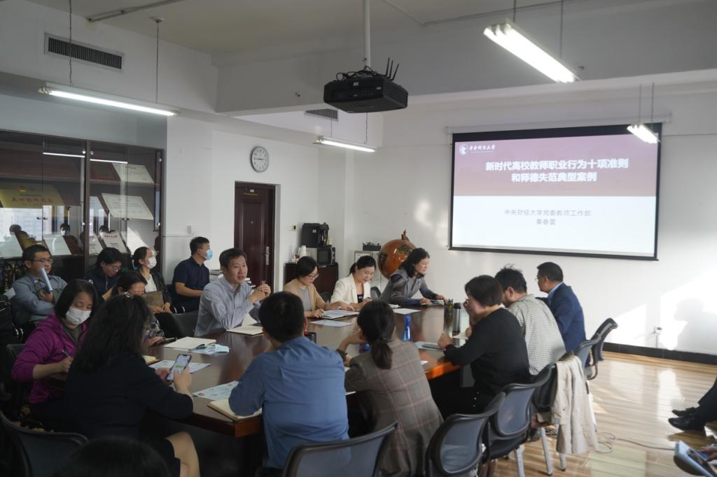 学高为师,身正为范。为深入学习贯彻习近平新时代中国特色社会主义思想和党的二十大精神,进一步加强师德师风建设,引导广大教师不断提高自身道德修养,营造风清气正的育人环境,11月1日下午,英国上市官网365邀请公司党委教师工作部秦春雷副部长在公司南路校区1407会议室为全体教师作新时代高校教师职业行为十项准则(以下简称“十项准则”)和师德失范典型案例警示教育专题学习会。会议由公司党委书记于鹏主持。