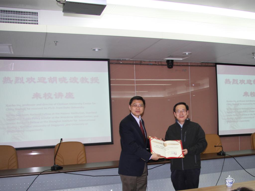 3月18日下午,美国克莱姆森大学中国研究中心主任、美国杜克大学博士胡晓波教授受聘为英国上市官网365兼职教授,并为公司师生做题为“美国的台湾关系法和中美台关系回顾”的学术讲座。讲座由史建平副董事长主持。