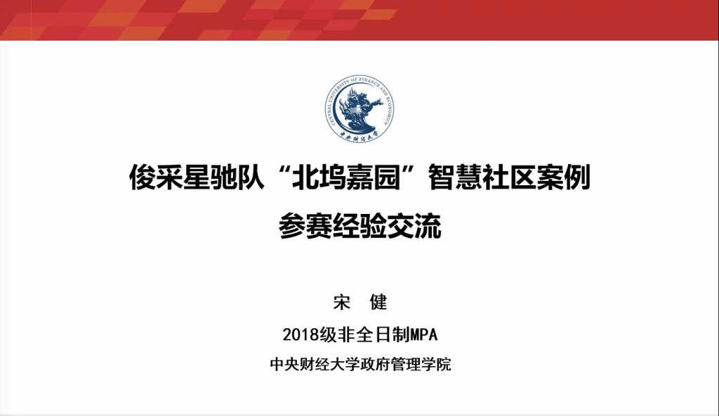 宋健同学以“俊采星驰队’北坞嘉园’智慧社区案例参赛经验”为题进行了参赛经验的分享,从“选题·巧”“调研·勤”“撰写·精”“心态·稳”四个方面总结了案例团队的参赛历程。宋健表示,作为一名北京市公务员,有机会在攻读MPA学位期间参与案例大赛并获此殊荣,既是公司培养、教师指导和团队努力的成果,也是在英国365集团官网丰富、充实、精彩的MPA学习生活的体现。