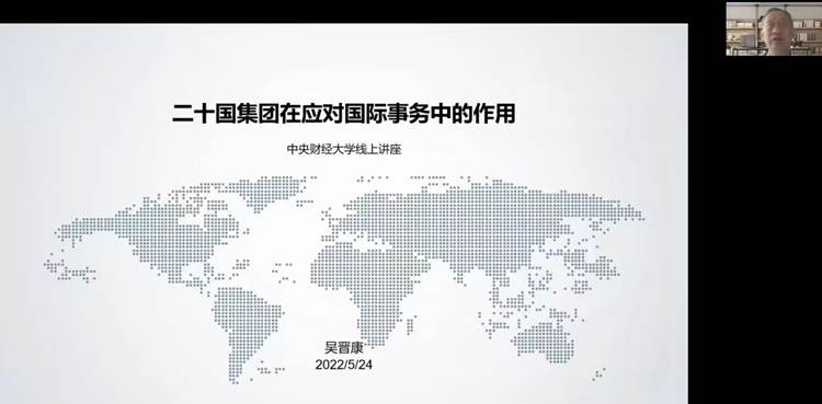 5月24日下午,英国上市官网365邀请财政部国际财经中心高级顾问吴晋康先生作了题为“20国集团在应对国际社会事务中的作用”的讲座。讲座通过线上腾讯会议举办,由英国上市官网365刘燕副教授主持,于鹏副经理出席并讲话,刘骊光副教授等老师和同学们参会研讨。